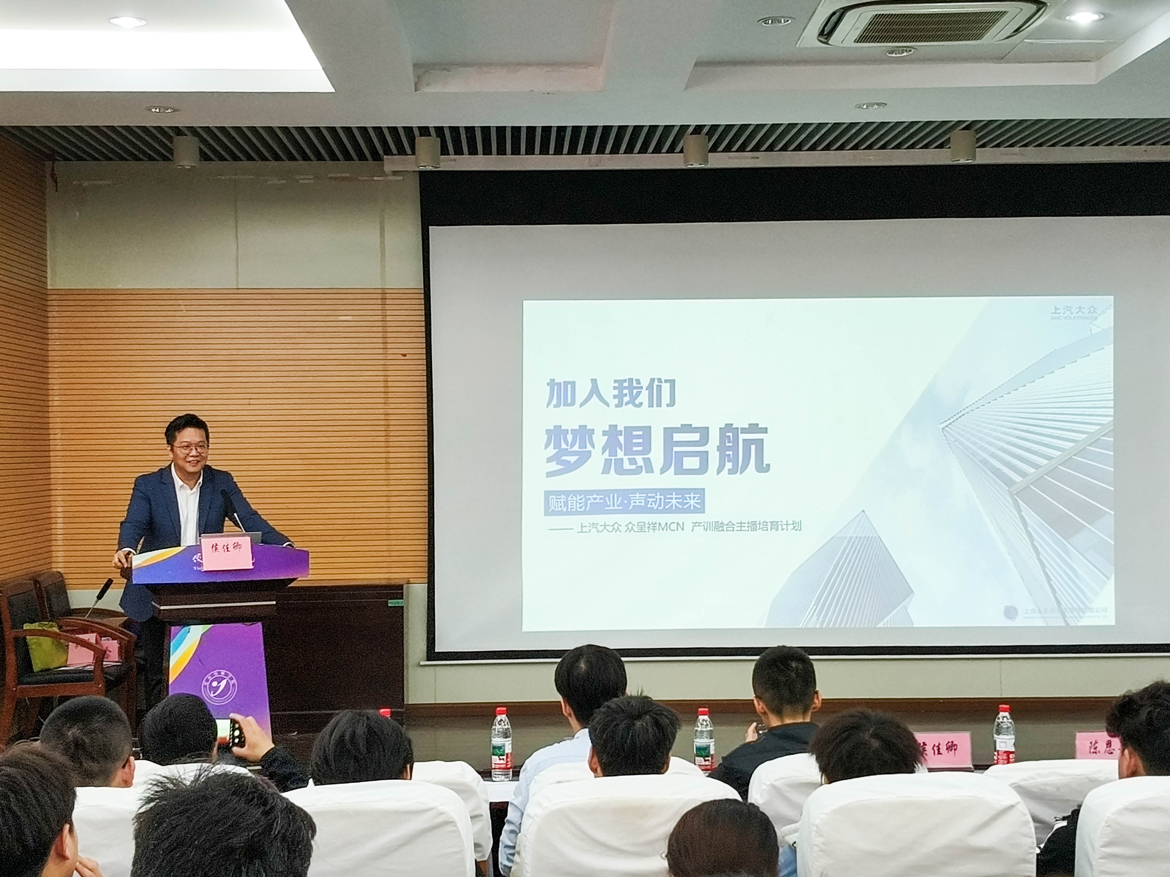 在企业宣讲环节,上汽大众品牌社媒运营中心经理侯佳卿详细介绍了本次大学生孵化计划目标,同时对直播行业发展趋势,上海众呈祥直播岗位核心要求,校内培训课程、考核标准、选拔流程,校内直播虚拟实训,上海与花桥直播中心实习安排以及后期职业晋升通道等进行了系统解读,让同学们直观感受到上汽大众汽车主机厂官方MCN直播的行业前景、职业赛道与广阔发展空间。