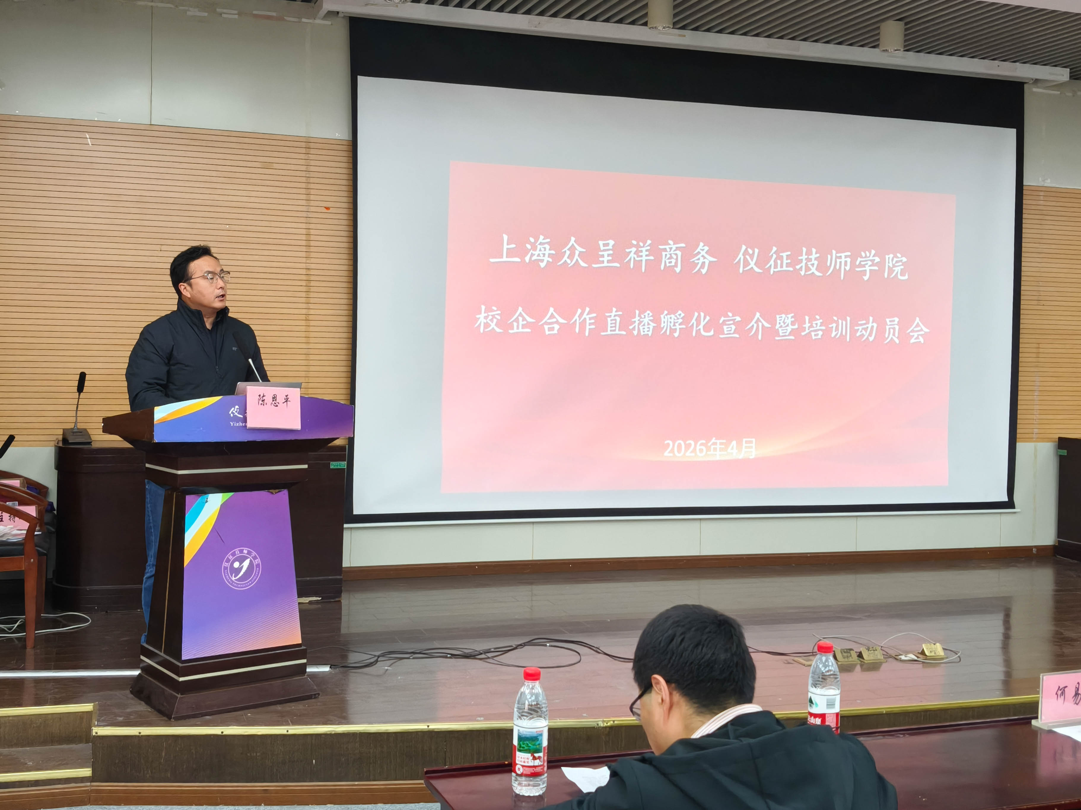 会上,电子信息系主任陈恩平致辞,他详细介绍了校企合作背景与直播孵化项目的重要意义,充分肯定上海众呈祥、上汽大众品牌社媒运营中心的行业资源与实训平台优势,鼓励全体同学珍惜难得机遇,主动拥抱新媒体行业,把专业学习与岗位实践紧密结合,在实战中提升技能、增长才干。