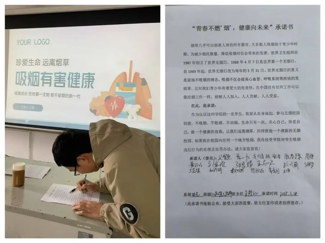 为增强同学们对吸烟危害的认识,引导学生远离烟草,进一步净化校园环境,营造文明、健康、和谐的校园氛围,3月28日下午,仪征技师学院开展了“青春不燃‘烟’,健康向未来”主题班会活动。