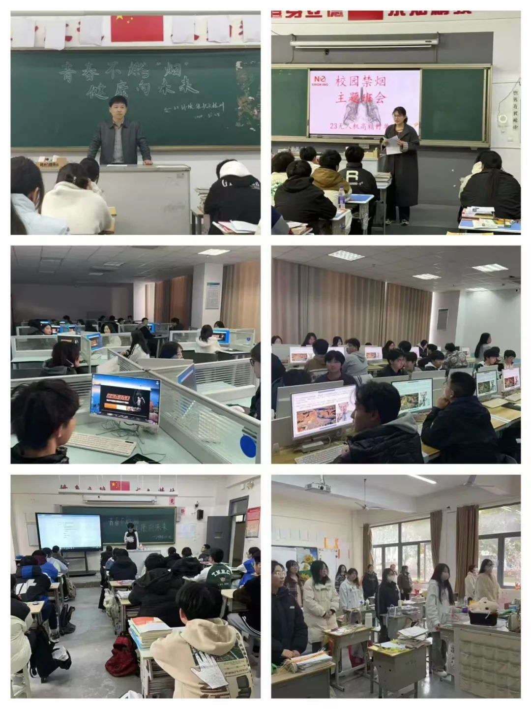 各系部按照活动方案,认真组织,确保活动顺利开展。活动中,各班级黑板上都醒目地写着活动主题等信息,营造了浓厚的活动氛围。在班主任的组织下,各班级通过多种方式深入探讨吸烟的危害。学生们积极参与,认真听讲,热烈讨论,表现出了对控烟工作的高度关注和热情。部分班级开展禁烟演讲,学生们通过生动的演讲,讲述吸烟对健康的严重危害,呼吁大家共同抵制烟草。部分班级通过制作禁烟PPT,观看禁烟相关视频,进一步加深了学生们对控烟重要性的认识。