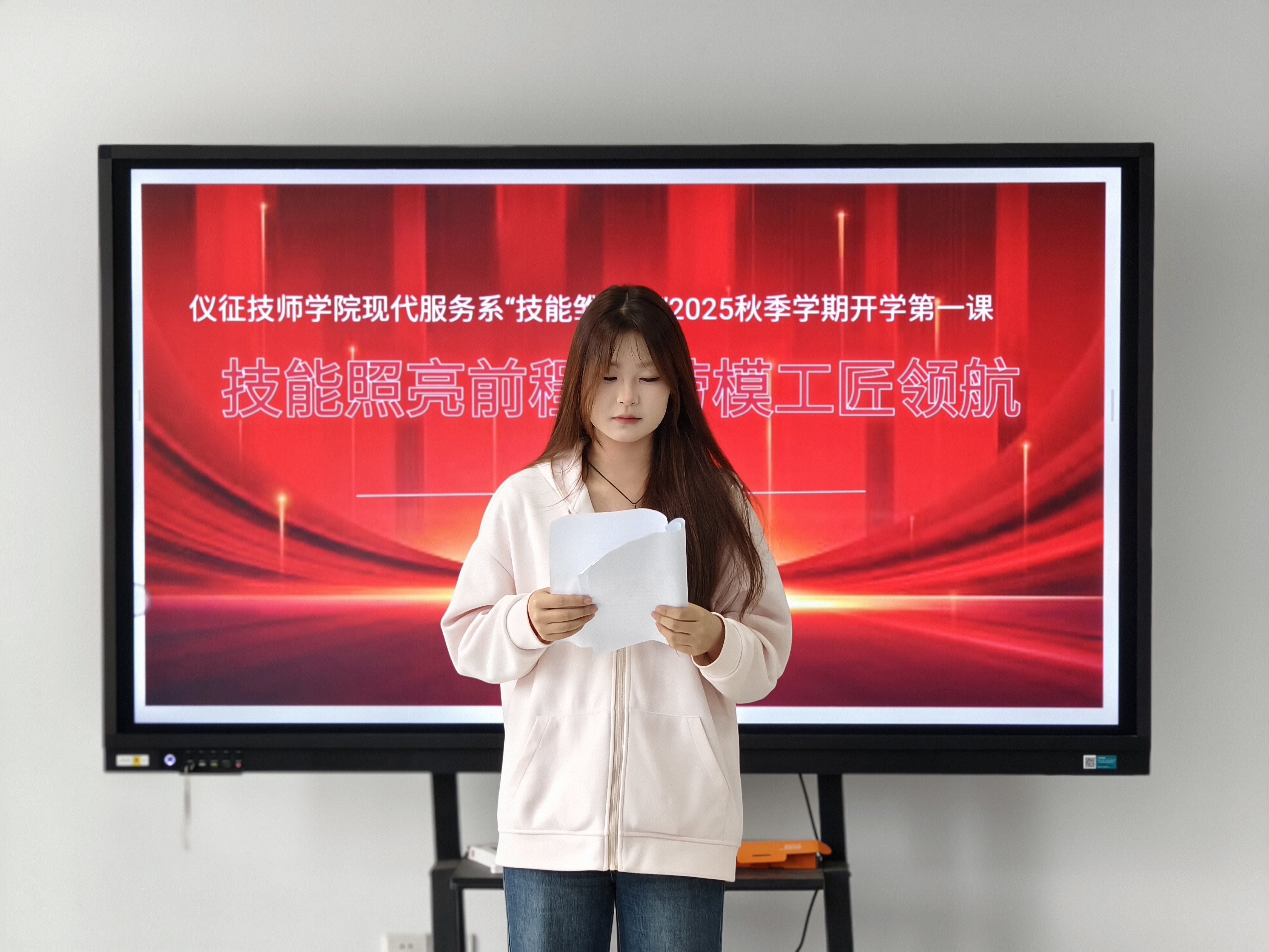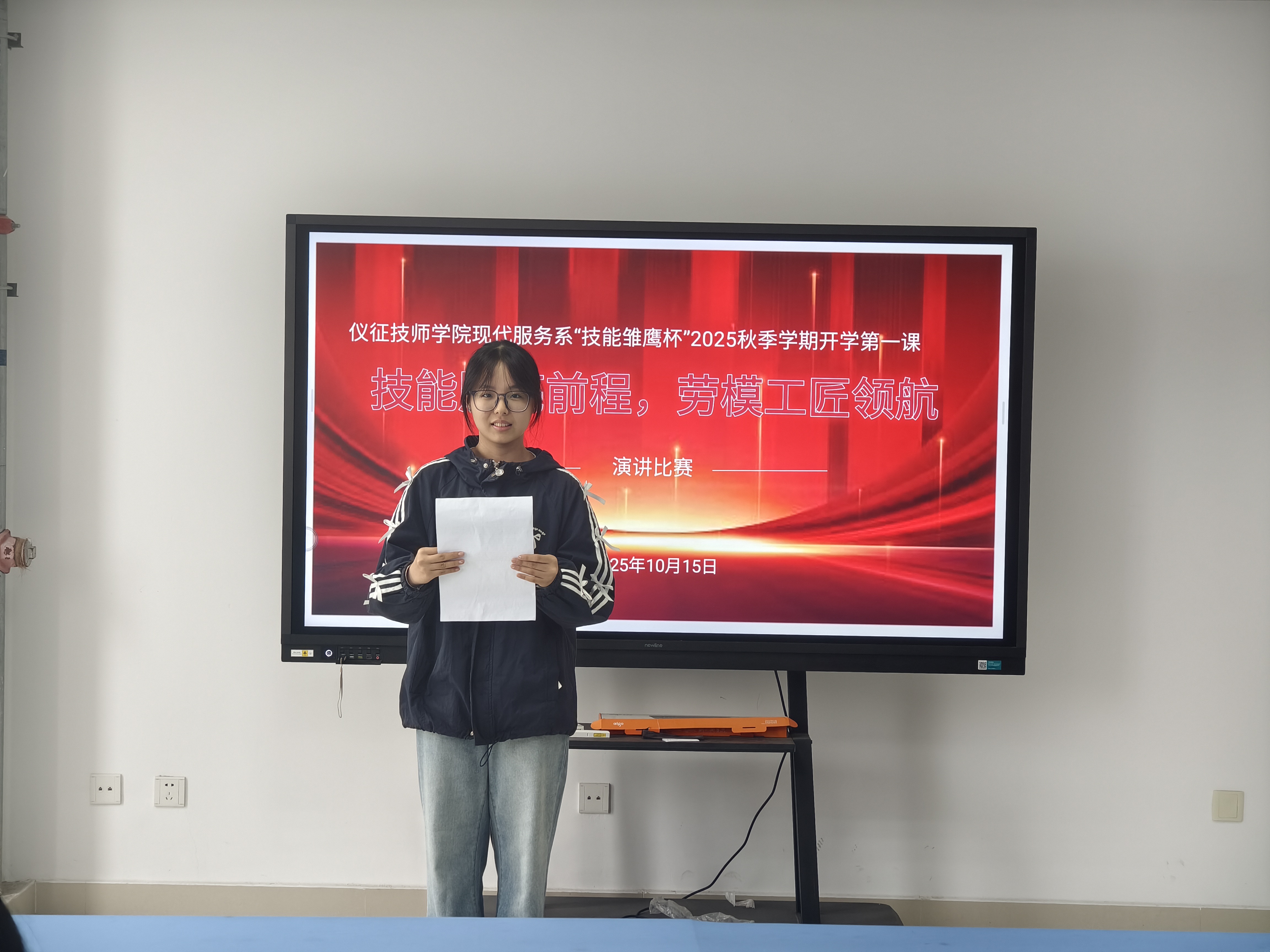 10月15日上午,仪征技师学院现代服务管理系组织开展了“技能雏鹰杯”2025秋季学期开学第一课演讲比赛。系党支部书记戴红梅、团总支副书记俞登月及各班团支部书记共同参与,活动由系团总支书记钱国钰主持。