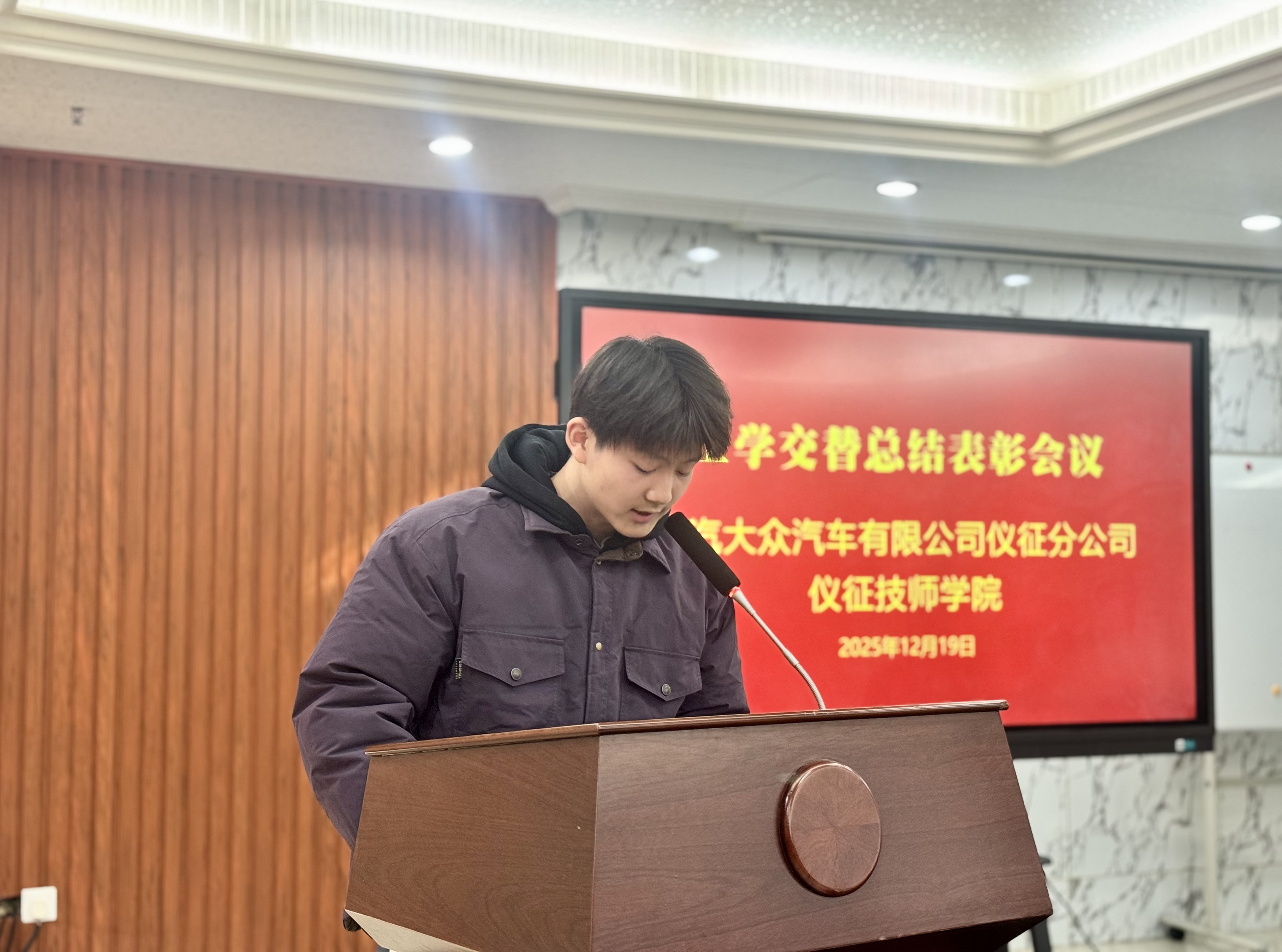 优秀学员代表、23机电班学生徐云童在发言中分享了工学交替实践体会。他坦言,通过走进企业生产一线,在企业师傅的指导下,将课堂理论与岗位实践紧密结合,不仅提升了专业技能,也深刻体会到严谨细致、精益求精的工匠精神,这段经历将成为今后学习和职业发展的重要财富。