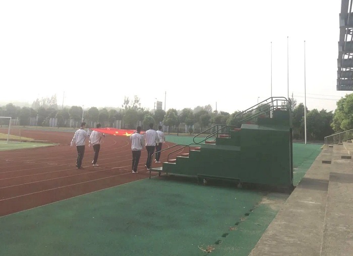 英姿飒爽的国旗护卫队队员们,迈着铿锵的步伐来到了国旗台下。伴随着庄严的国歌,升旗手振臂一挥,鲜艳的五星红旗徐徐展开,在师生的注目中,迎着初升的太阳,迎风飘扬在校园上空。