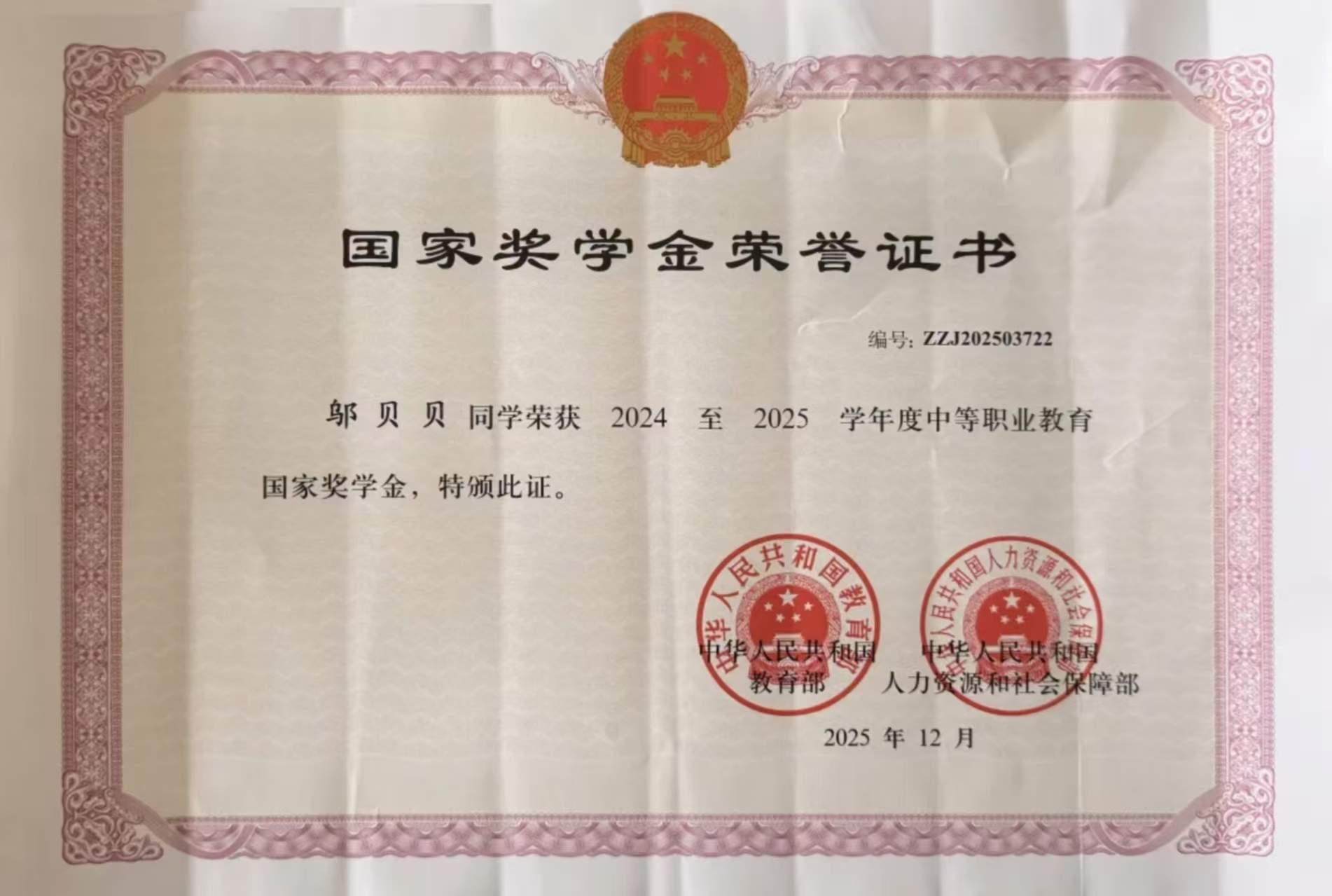 中职国家奖学金是对邬贝贝、邹慧同学德技并修、全面发展的充分肯定。未来,她们将继续坚定理想信念,提升专业技能,在技能成才、技能报国的道路上不断奋进。