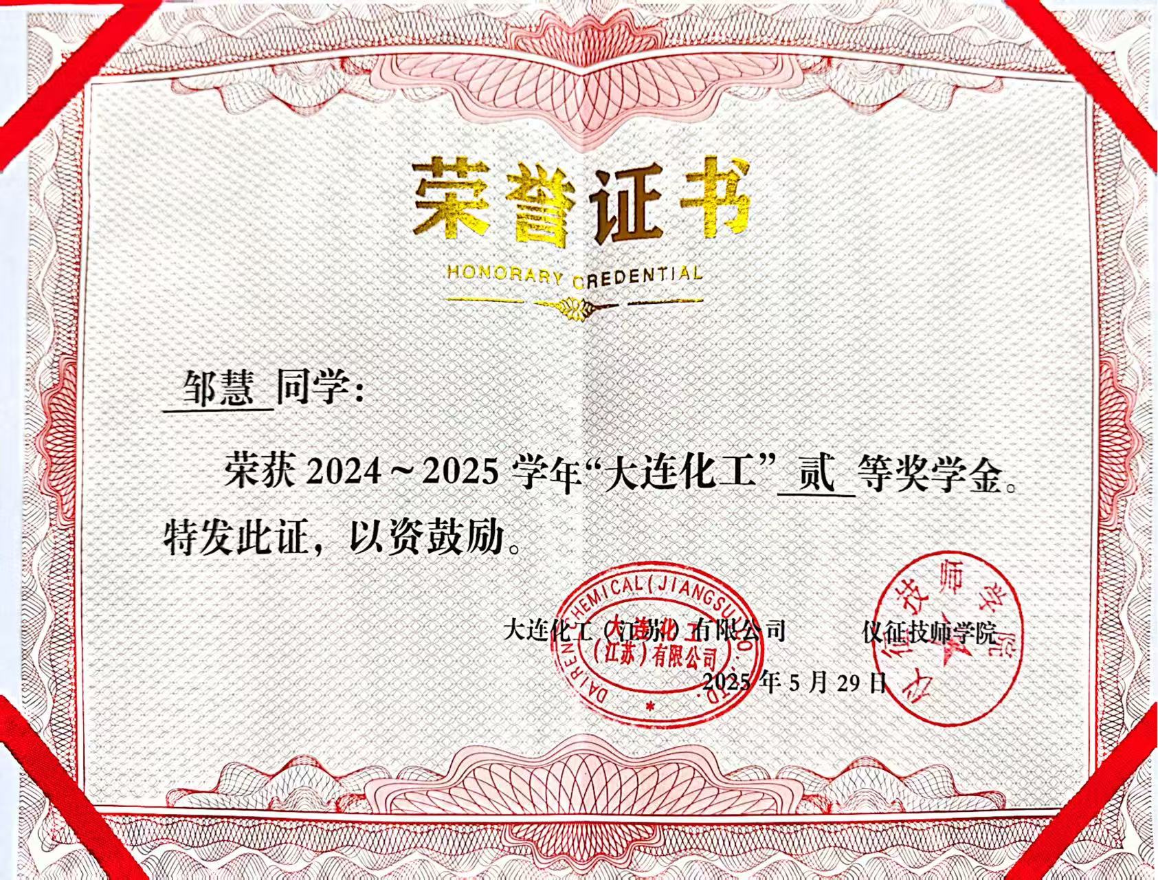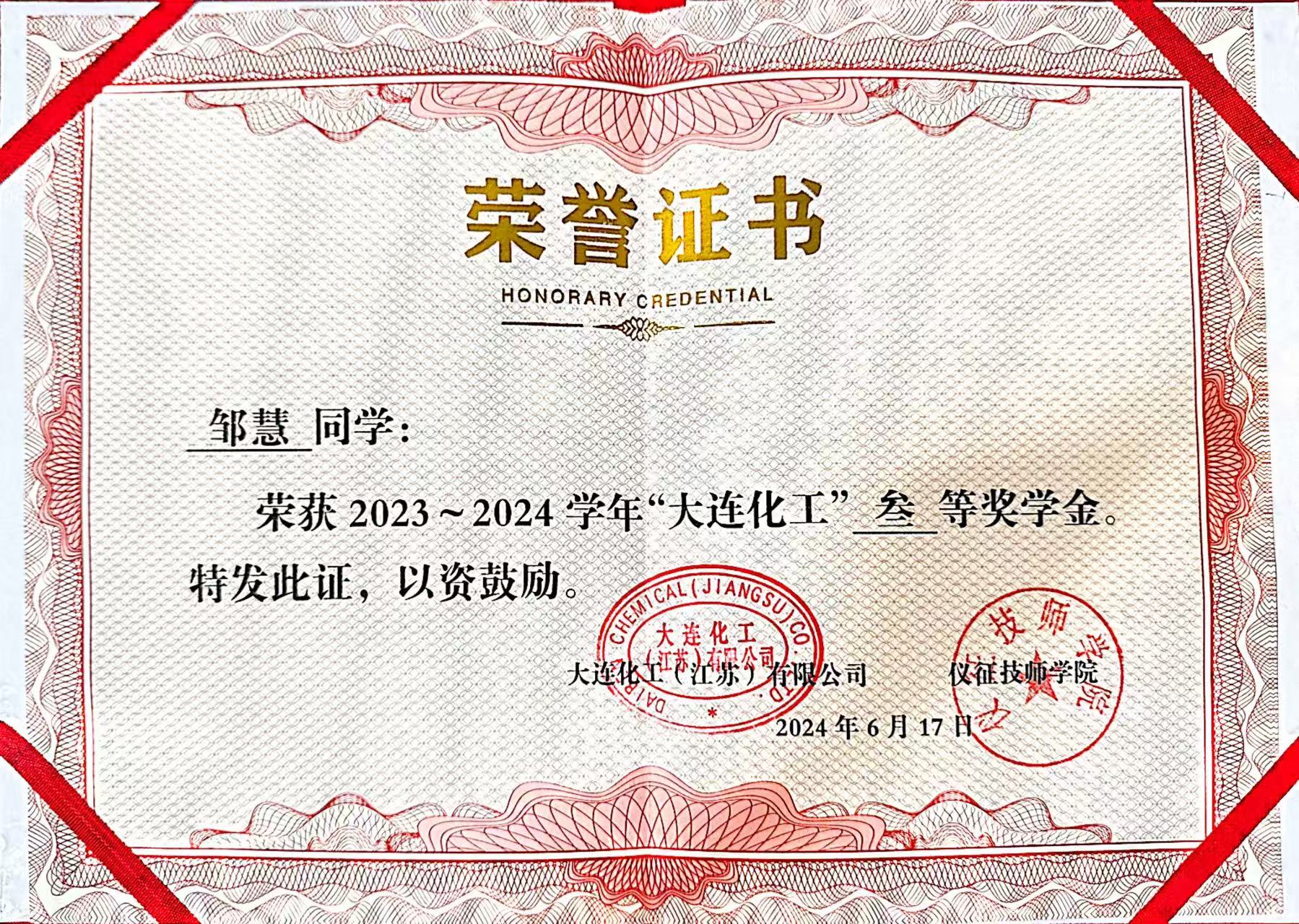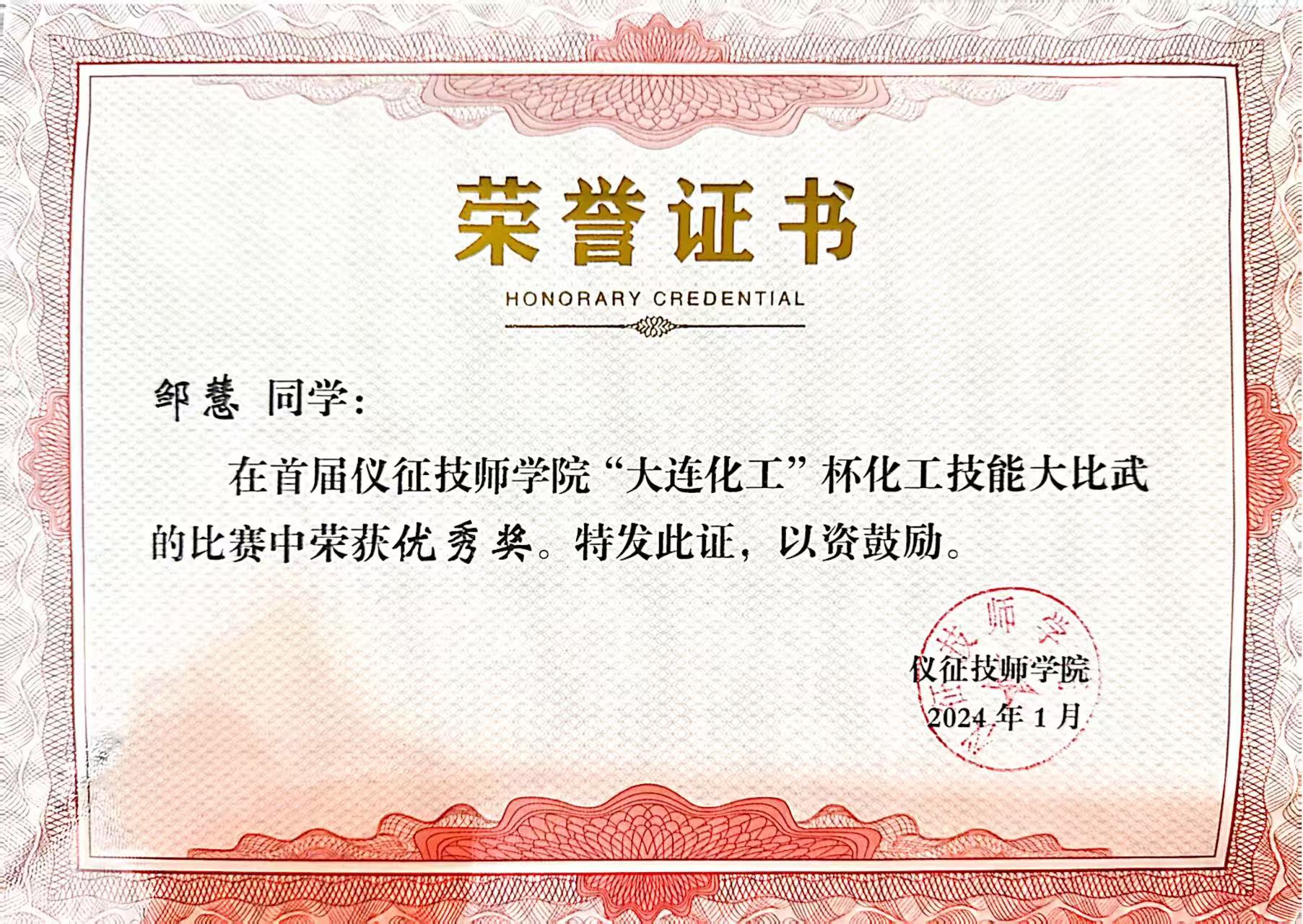 在技能竞赛方面,邹慧表现尤为亮眼。2023年,她参加“江苏工匠”岗位练兵职业技能竞赛暨江苏省生产事故应急救援职业技能竞赛总决赛,通过系统训练,熟练掌握心肺复苏、人工呼吸等急救技能,显著提升了应急处理能力。同年,她在“大连化工”杯化工技能大比武中荣获优秀奖。2025年,她在扬州市第21届中等职业学校技能大赛中斩获化学实验室项目一等奖,并成功晋级省赛;随后代表学校参加省级赛事,在更高平台上进一步锤炼专业技能与综合能力。同年,她再次在“大连化工”杯赛事中荣获二等奖,并获得二等奖学金,实现了专业成长的新突破。