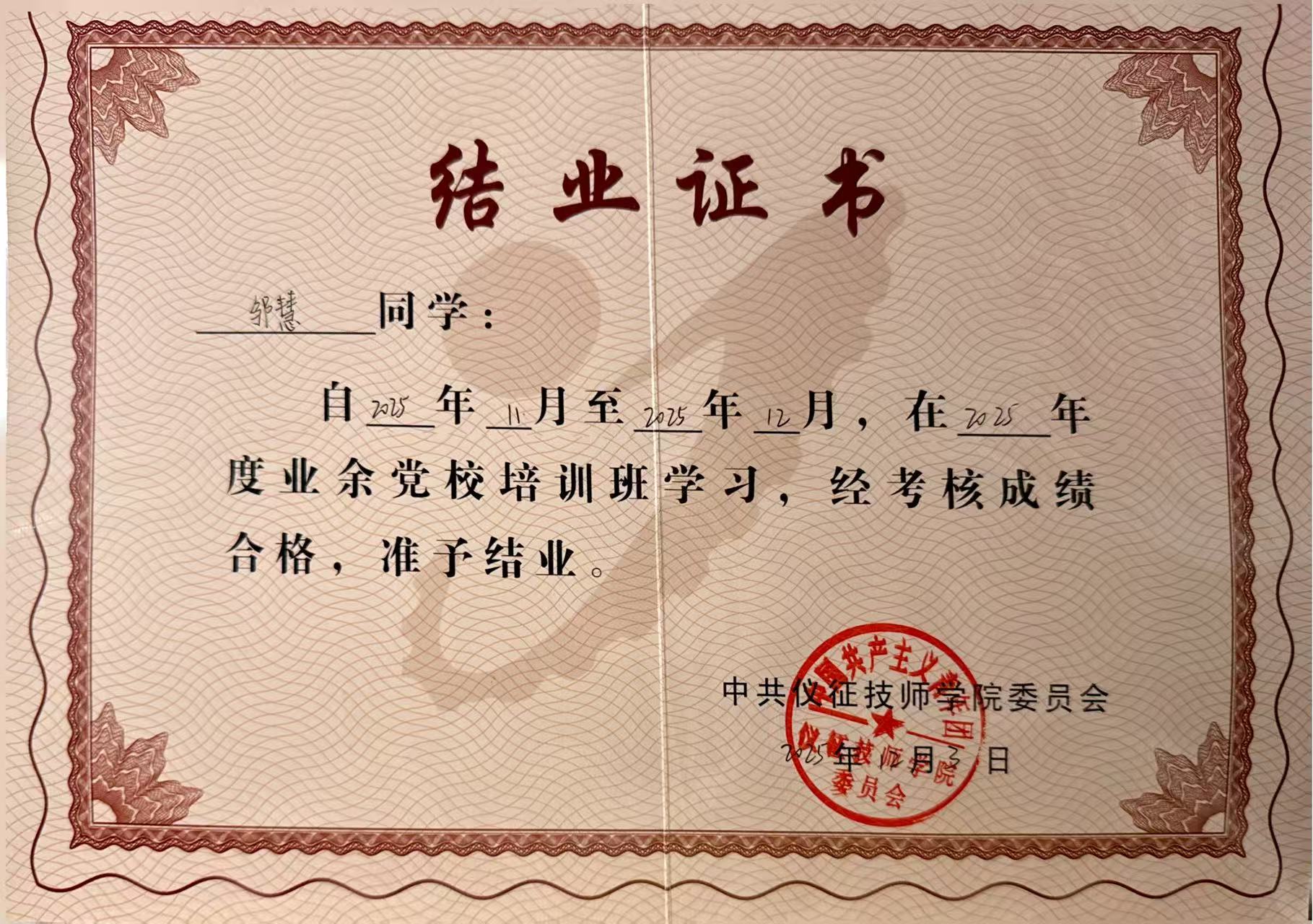 邹慧,2007年出生,共青团员。自入学以来,她始终秉持严谨认真、精益求精的学习态度,专注于专业技能的提升,在滴定实验、仪器操作等核心实训中表现突出。凭借勤奋自律的学习习惯,她的成绩长期稳居班级前列,并多次荣获“三好学生”称号。同时,她积极考取化学检验员初级工、中级工证书以及计算机一级B证书、普通话证书,不断夯实专业基础,提升综合素养。