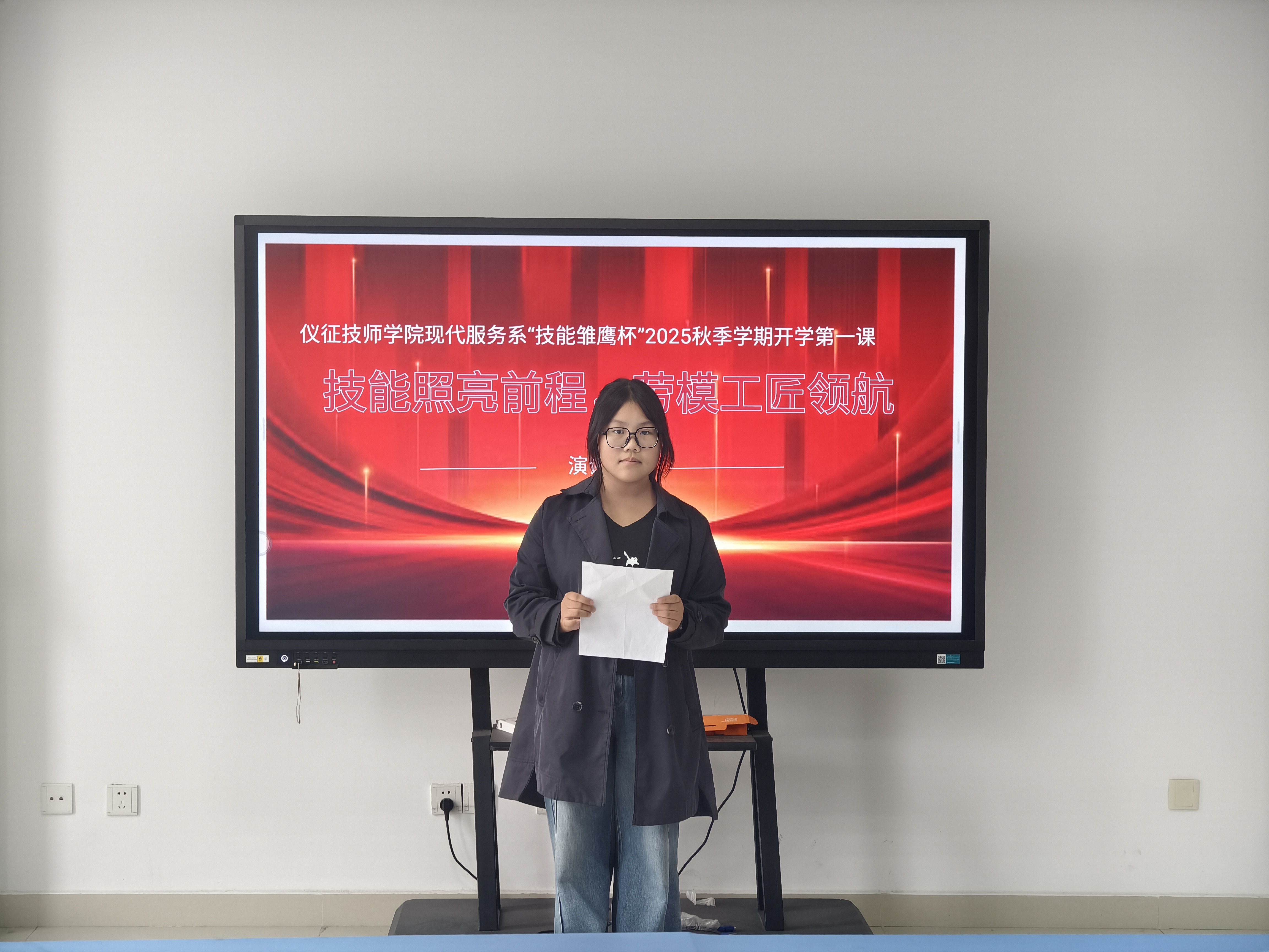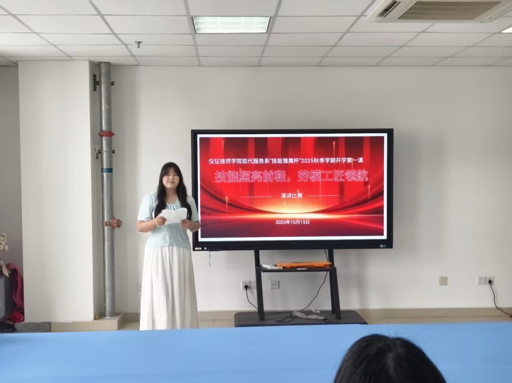 10月15日上午,仪征技师学院现代服务管理系组织开展了“技能雏鹰杯”2025秋季学期开学第一课演讲比赛。系党支部书记戴红梅、团总支副书记俞登月及各班团支部书记共同参与,活动由系团总支书记钱国钰主持。