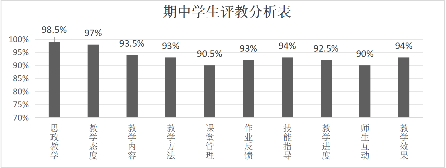 从评教结果来看,全院教师平均得分 98.9分,其中100分的教师有72人,95-99分的教师有246人,整体满意度处于较高水准。学生们在“思政教学”“教态教风”等维度对教师给予了高度肯定,好评率稳定在98%左右。但在“课堂管理效能”“师生互动活跃度”两方面,评分相对偏低,说明这些环节仍有优化空间,将成为下一阶段教学改革的重点突破方向。