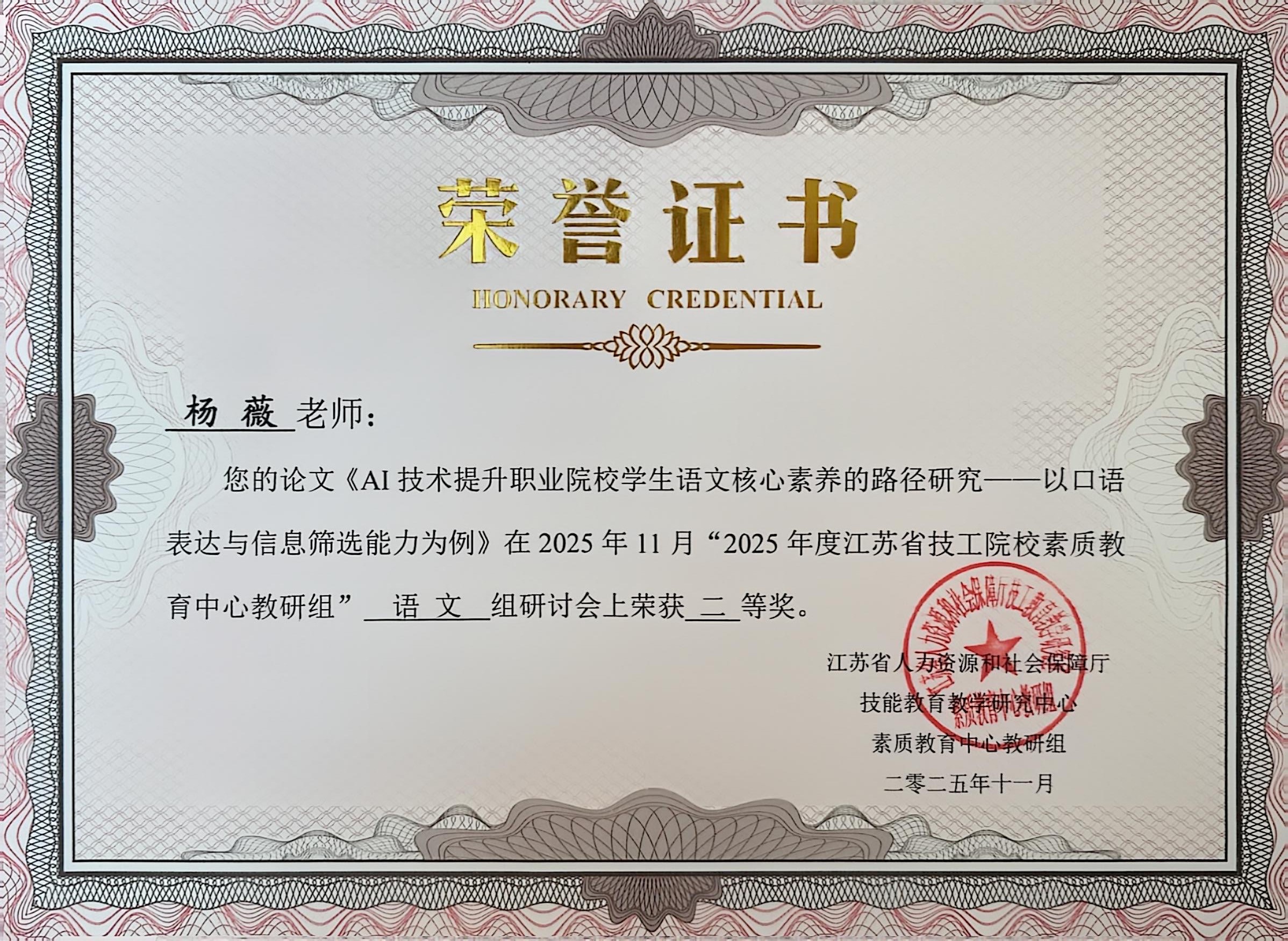 近日,江苏省技工院校素质教育中心教研组2025年度教科研成果评比结果揭晓,学院共获得一等奖1项,二等奖6项,三等奖5项。 本次教研活动旨在加强全省技工院校素质教育工作经验交流,促进技工院校教师职业能力提升,深化文化基础课教学改革。同时,活动组织开展了思政、语文、数学、英语、体育、历史等学科的教学成果评比。 一等奖 二等奖 今后,教研室将积极发挥优秀教学成果的示范引领作用,持续加强课程建设,继续深化教育教学改革,不断提升教科研质量水平。 审核:陈煜 通讯员:曹德臣