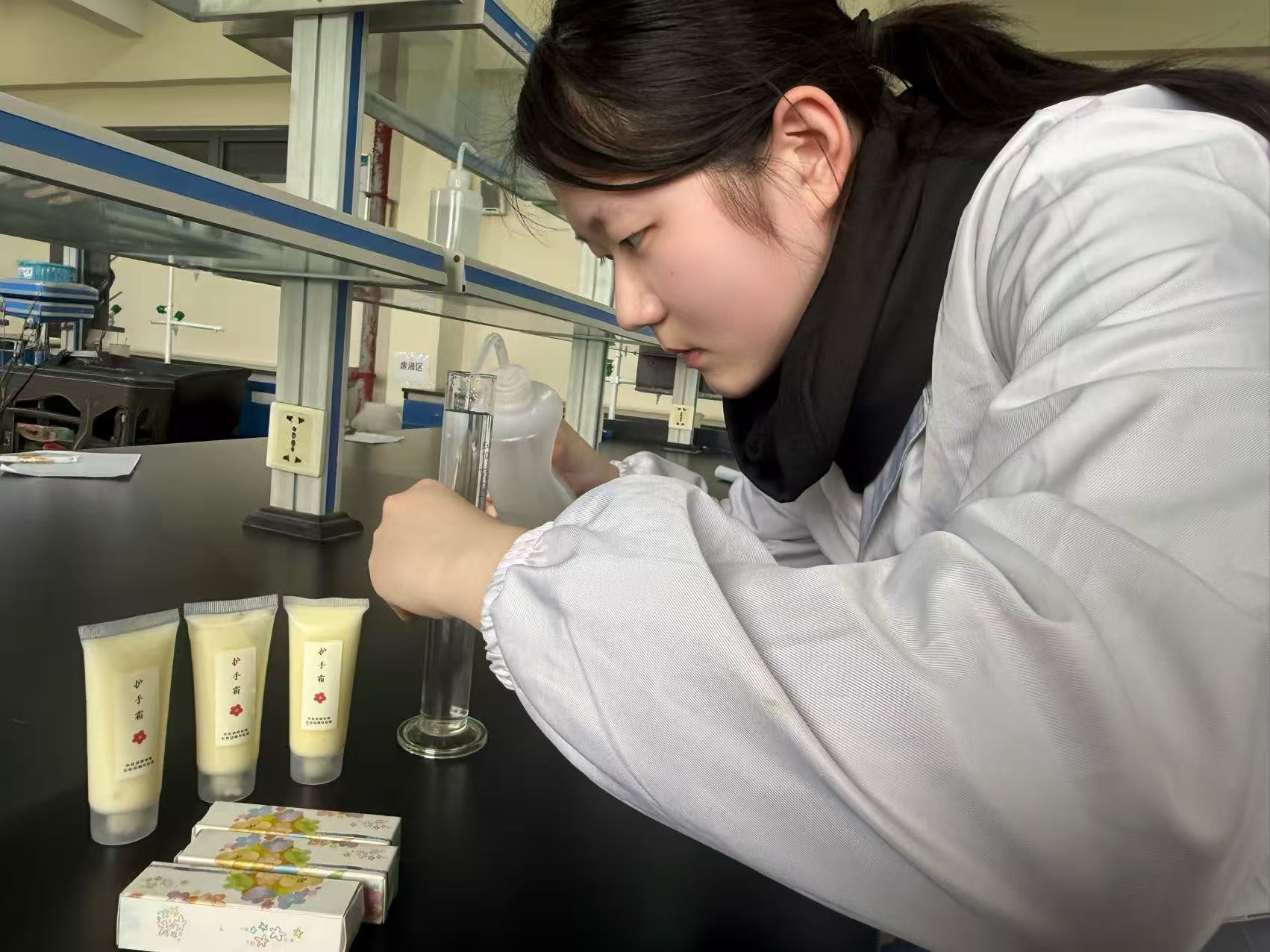 课堂上,老师细致讲解护手霜制作原理与安全操作规范,按照5ml油脂、0.83g乳化剂、50ml纯净水、1-2滴精油的精准配比,一步步示范加热、搅拌、乳化、调香、装瓶等流程。同学们认真聆听、有序操作,将原料充分融合,亲手制作出质地细腻、香气清新的专属护手霜。